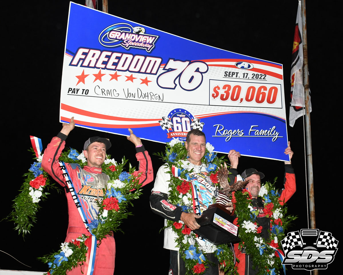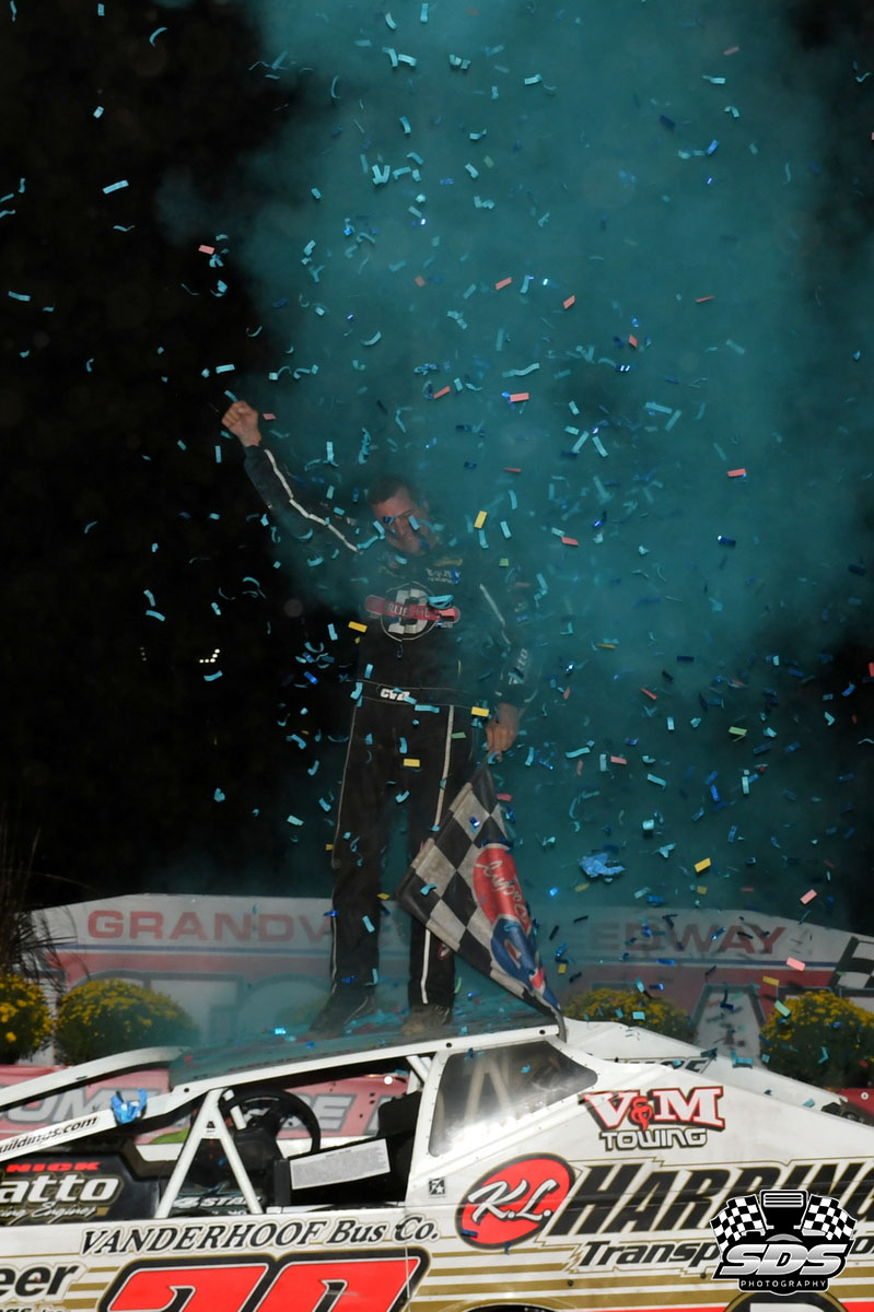 After 76 laps, it was Von Dohren standing on the roof of his car covered in confetti, holding a check worth $30,060. A fitting ending. Kressley and Jeff Strunk joined him on the podium.
